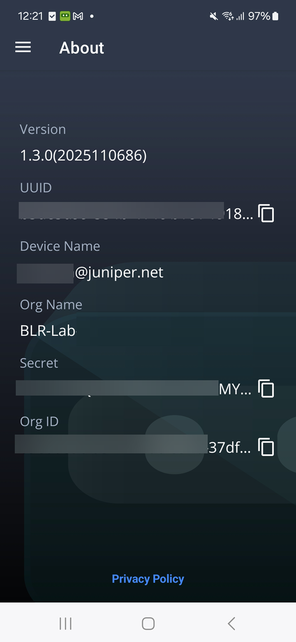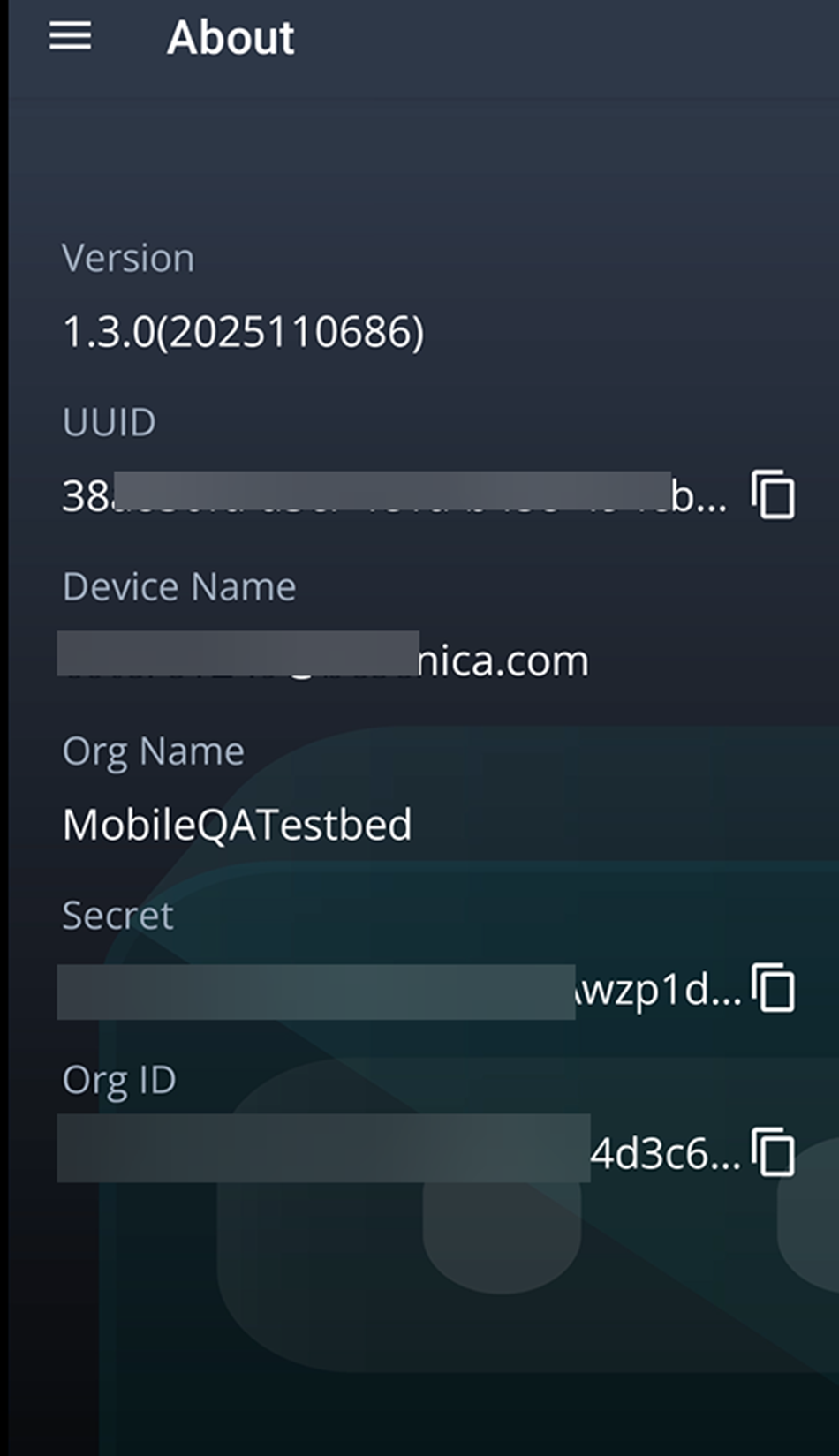 No modo Admin, a página Sobre exibe o UUID, o nome do dispositivo, o ID da organização e o nome da organização.