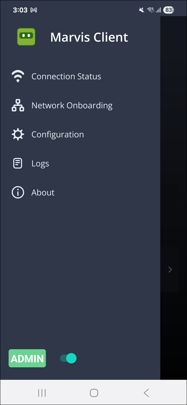 Ao abrir o cliente Marvis no modo de integração ou telemetria, você verá apenas as opções Integração de Rede e Sobre . Para ver outras opções de menu, você precisará alternar para o modo Admin: