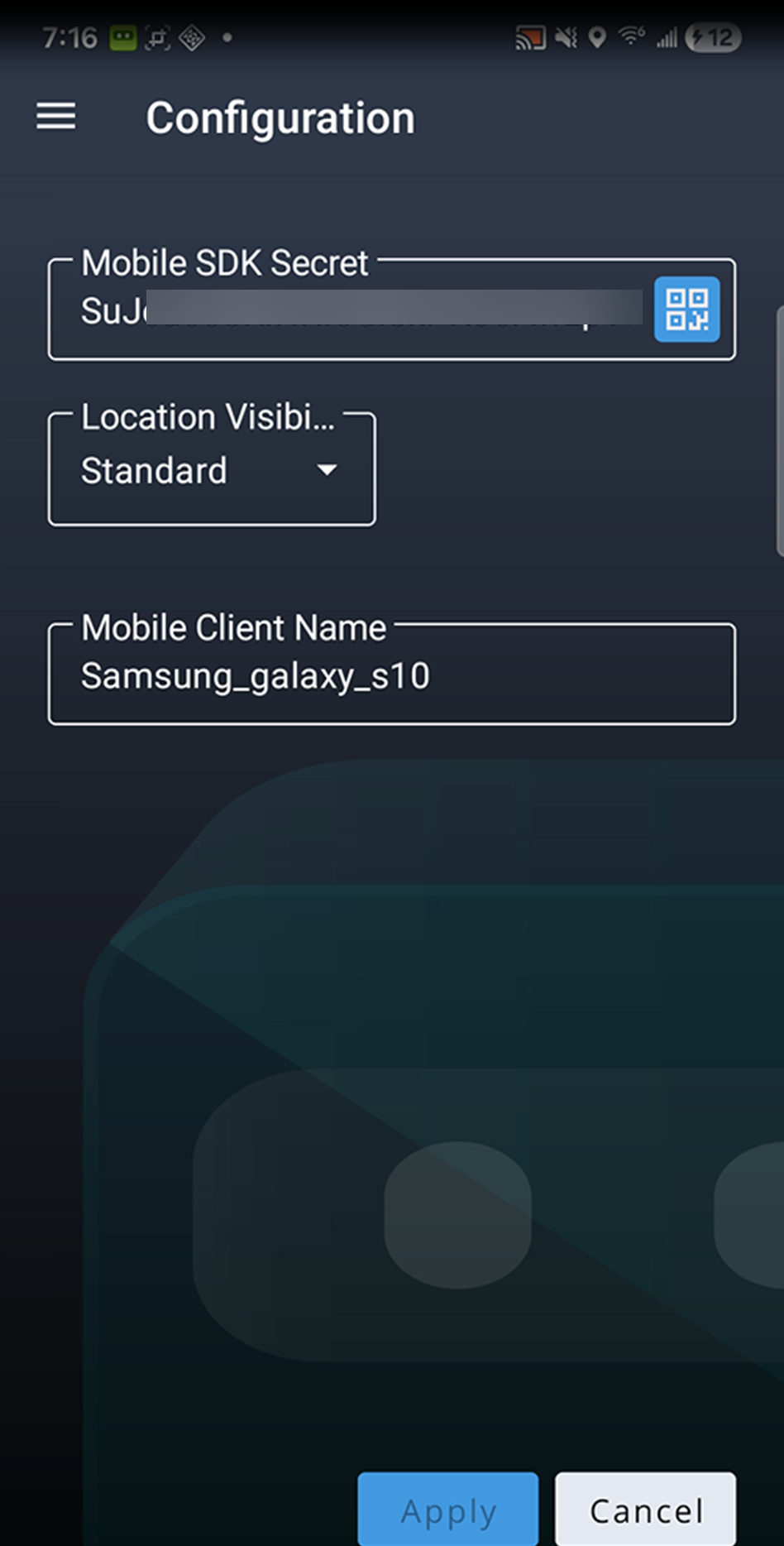 Você pode usar a opção Configuração para atualizar ou verificar o nome do cliente, o acesso ao local e o token do SDK móvel.