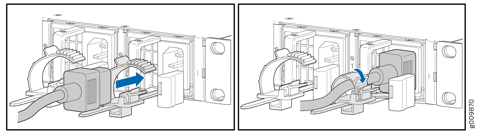 Push the end of the AC power cord retainer strip into the hole next to the inlet on the power supply faceplate until it snaps into place. Ensure that the loop in the retainer strip faces toward the power cord.