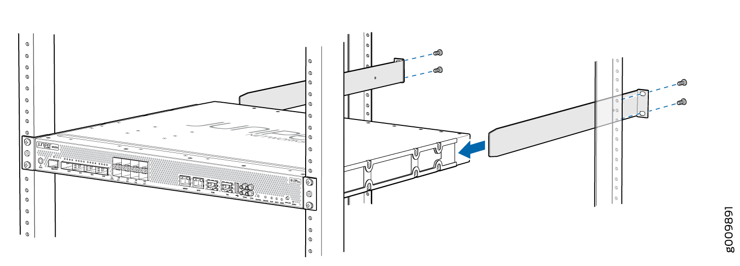 Visually inspect the alignment of the chassis. If the chassis is installed properly in the rack, all the mounting screws on one side of the rack are aligned with the mounting screws on the opposite side and the router is level. A fully secured and installed router in a four-post rack is shown: