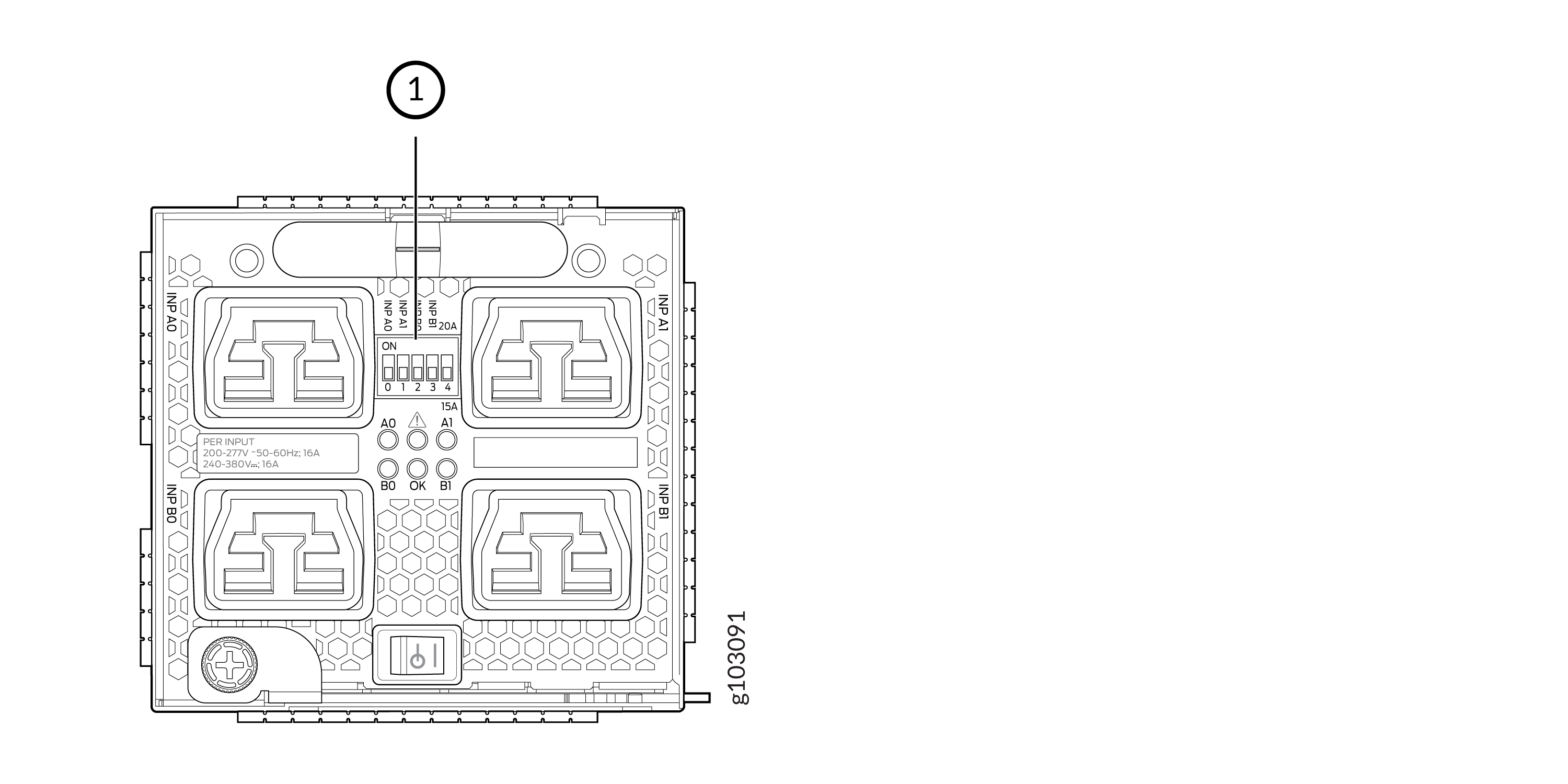The JNP10K-PWR-AC3H Power Supplies have five dual position DIP switches (INP-A0, INP-A1, INP-B0, INP-B1, and DIP4) that are accessible from the front panel. DIP4 is the fifth DIP switch, which is used to indicate whether 20A or 15A input source is connected. See Figure 12 and Table 15 to know the layout of the DIP switches and the power output when the DIP switches are set in different combinations.