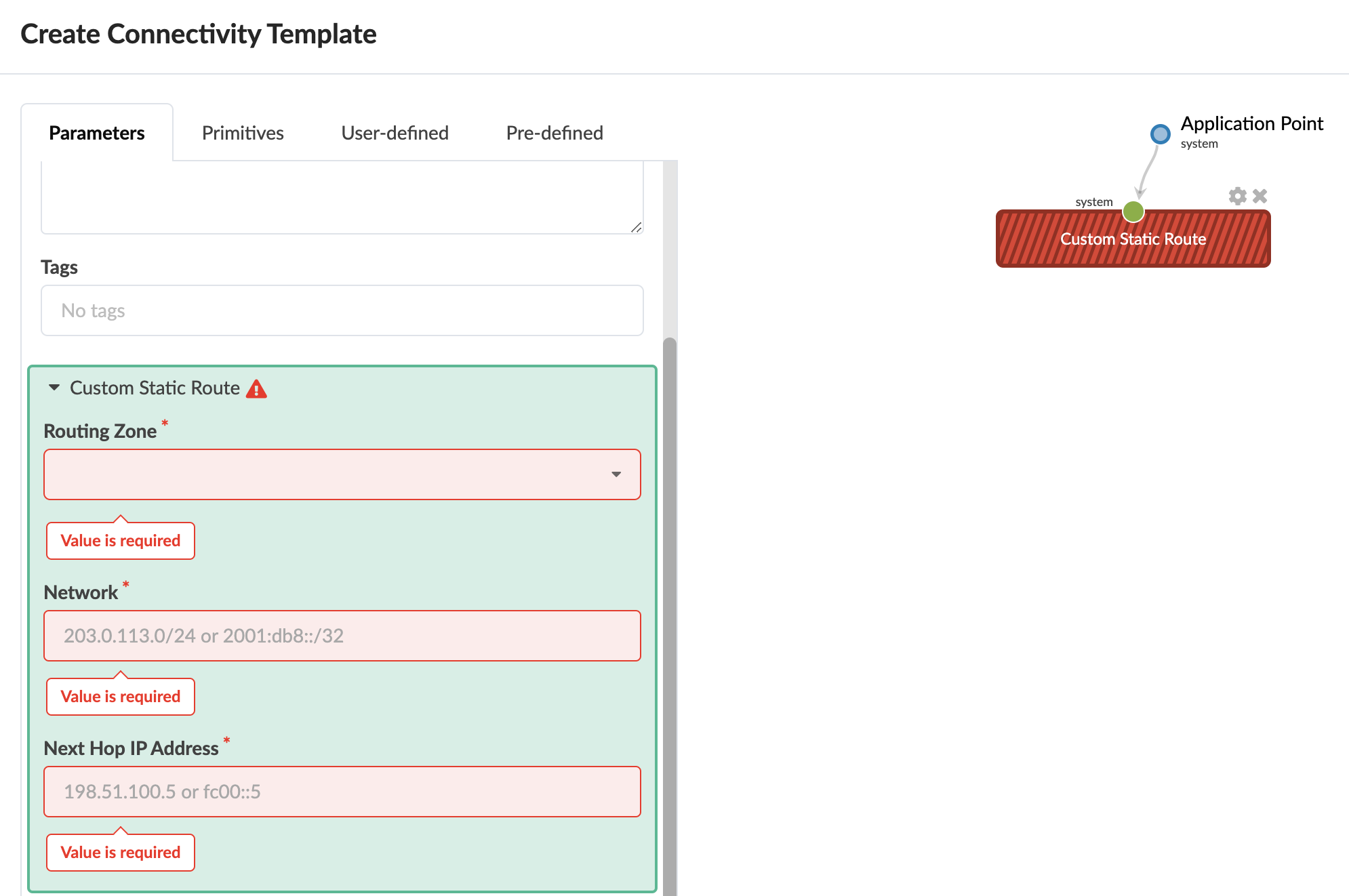 If the next-hop IP address is not accessible, the static route will not be installed. Apstra software cannot monitor the next-hop IP and will not alert you if it is not accessible. It is your responsibility to configure the custom static route primitive correctly.