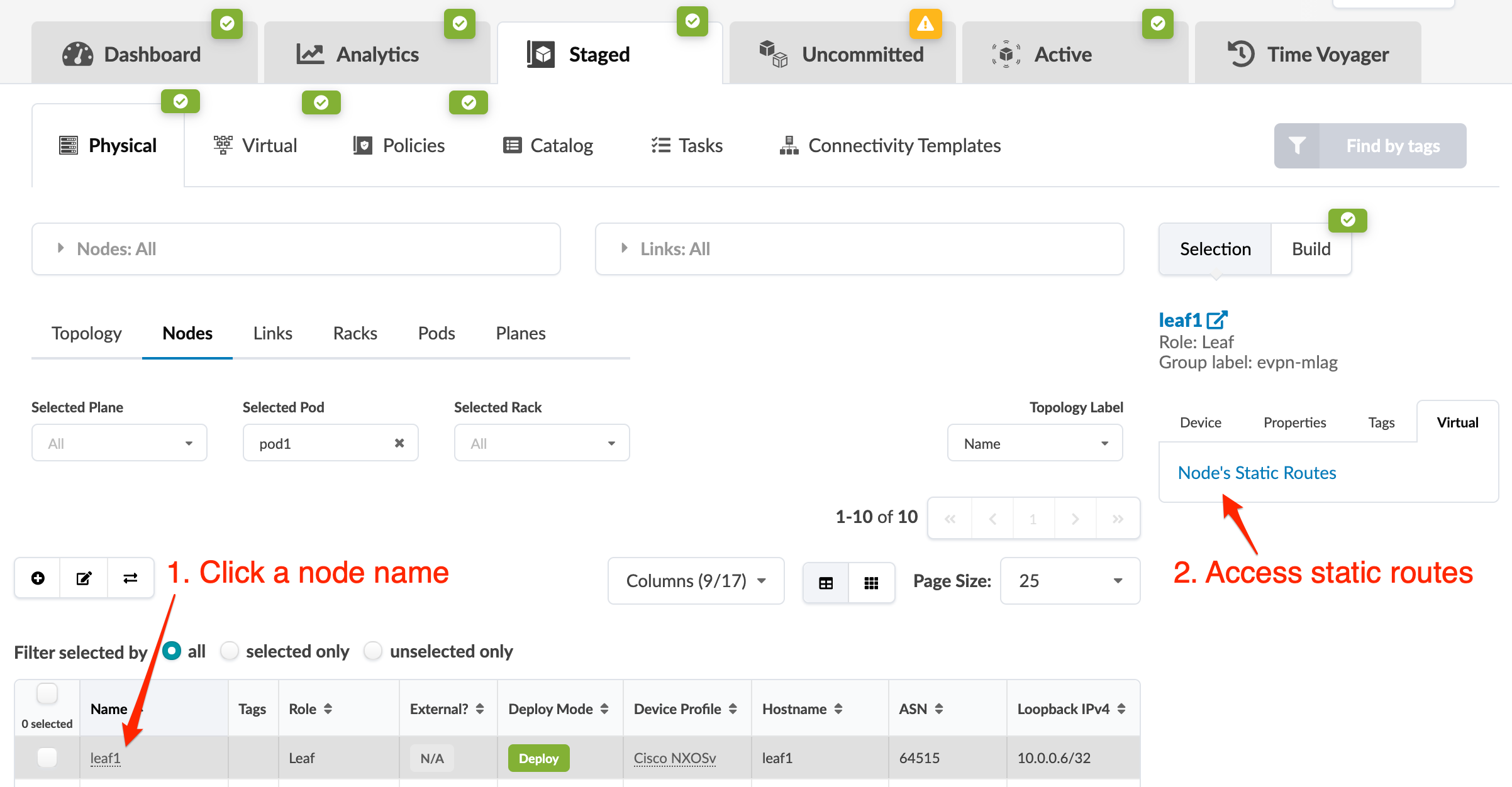 - Click Node's Static Routes to go to Staged > Virtual > Static Routes where you can see that node's static routes.