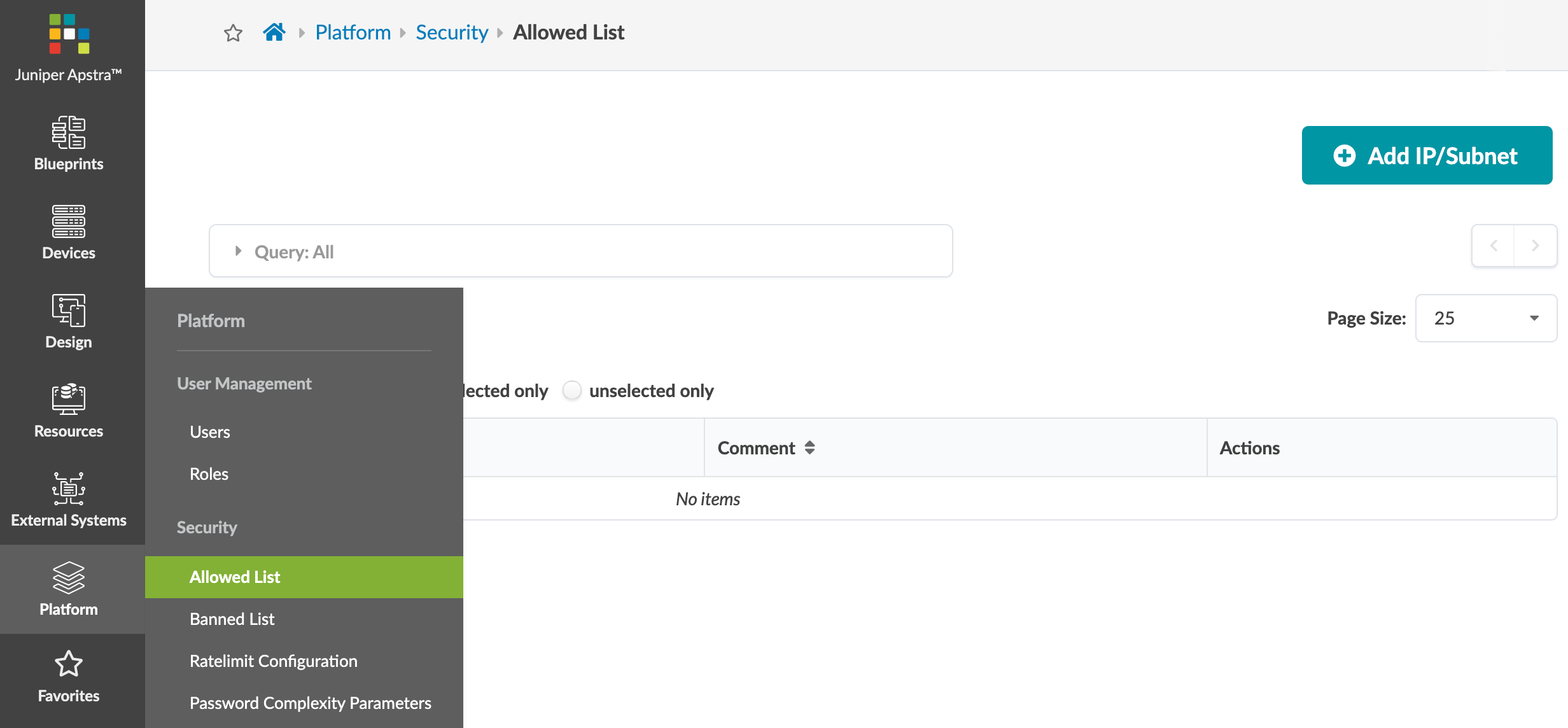 - From the left navigation menu, navigate to Platform > Security > Allowed List and click Add IP/Subnet.
