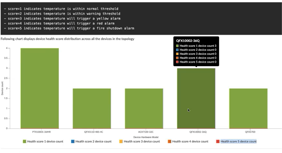For example, Figure 5 shows the device health score that is distributed across all the devices in the topology. In this chart, all hardware models are shown as green. When you hover over each model, you can see the health score for each device. In this example, each device is assigned "score=1" indicating that the temperature is within the normal threshold.