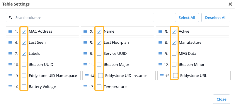In the Table Settings window, select the check box for each column to include. Clear the check box for each column to remove. Close the window to apply the changes.