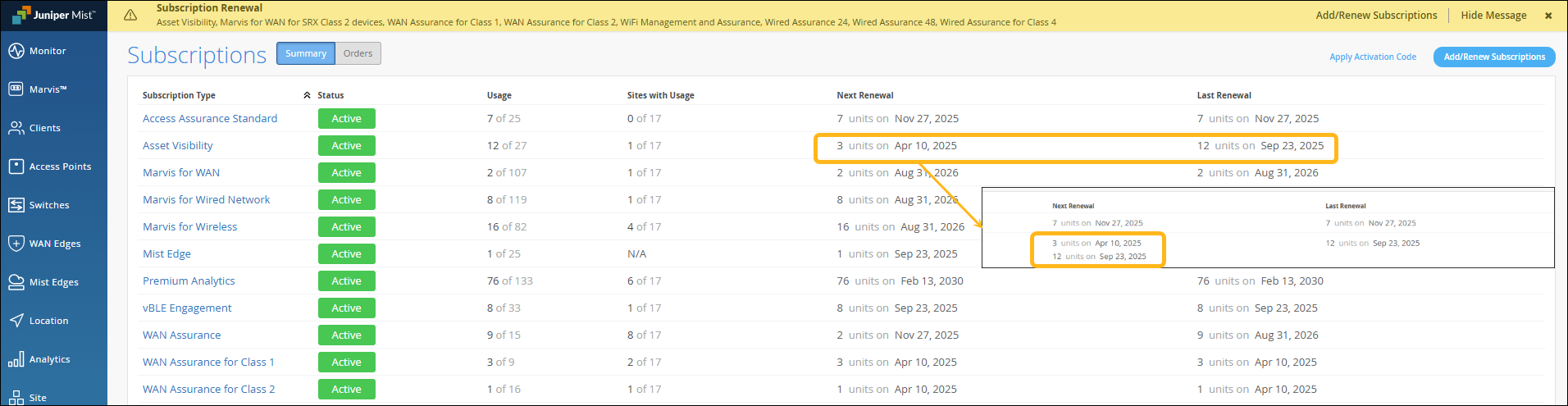 Juniper provides 90 days' notice of subscription expiration so that you can plan renewals accordingly. Reminders also appear in a banner message at the top of the Juniper Mist™ portal.
