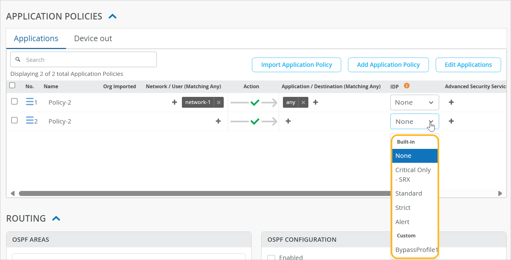 To enable intrusion detection and prevention, apply an IDP profile to an application policy.
