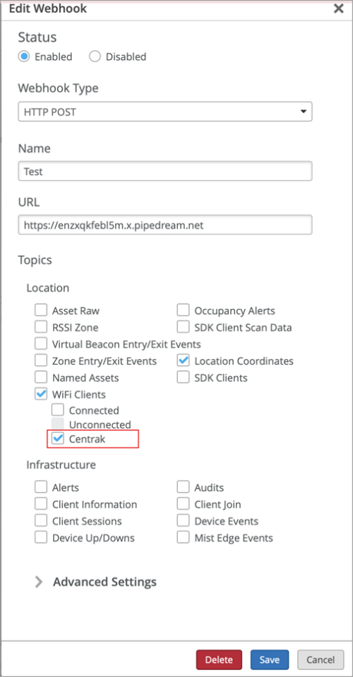 We have introduced support for a new webhook subtopic for Centrak tags under the WiFi Client topic. You can now separately subscribe to connected clients, unconnected clients, or Centrak webhooks. Previously, when you subscribe to the WiFi Client topic, you would get all the connected and unconnected clients information. The current enhancement provides more granularity by allowing you to subscribe only to the information that you require. For example, you can subscribe to the Centrak tags without having to subscribe to the connected and unconnected clients information. Note that Unconnected and Centrak subtopics are mutually exclusive, that is, you cannot select both together. To enable this feature, select Centrak under the WiFi Client topic on the webhook configuration screen (accessed by clicking Add Webhook on the Webhooks tile on the site settings page (Organization > Site Configuration > site name). The WiFi Client topic is available only when you select the Location Coordinates topic.