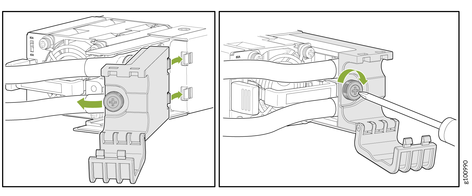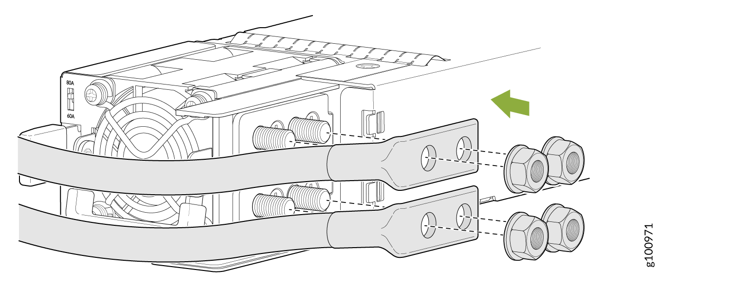 在将电源连接到 PTX10001-36MR 之前,有执照的电工必须将电缆接线片连接到您提供的接地电缆和电源线。接线片连接不正确的电缆可能会损坏 PTX10001-36MR(例如,导致短路)。