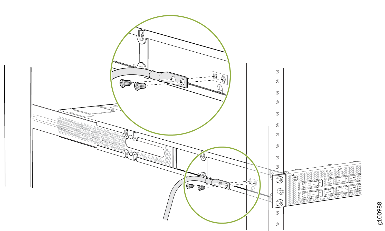 注意:为满足安全和电磁干扰 (EMI) 要求并确保正常运行,必须先将机箱接地,然后再将其接地。对于需要将单独的接地导体连接到机箱的安装,请使用 PTX10001-36MR 机箱上的保护接地端子连接到接地(请参阅将 PTX10001-36MR 连接到地)。