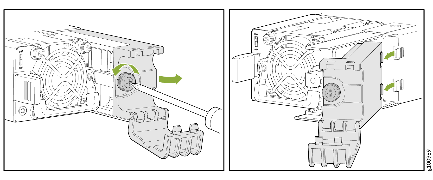 PTX10001-36MR 中的直流电源是可热拔除和可热插入的现场可更换部件。您可以在不关闭路由器电源或中断路由器功能的情况下卸下和更换它。但是,在尝试卸下设备之前,您确实需要断开电源。