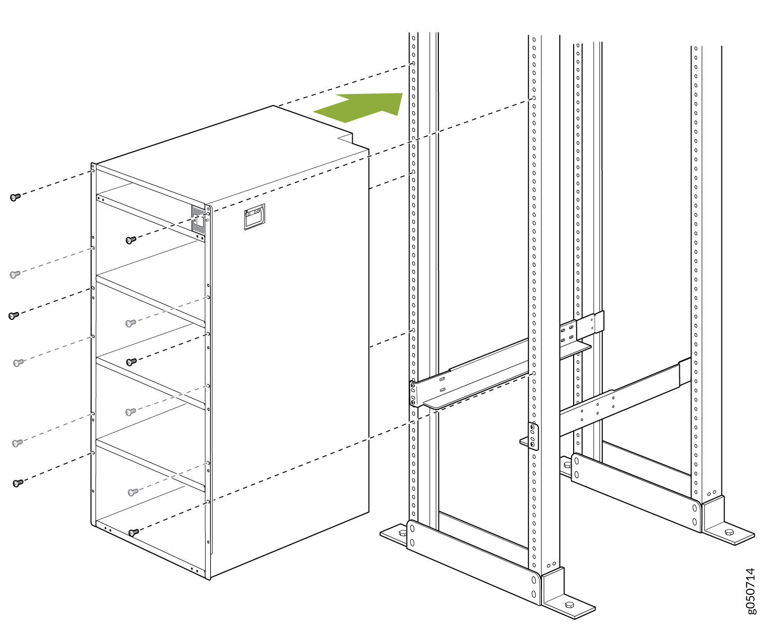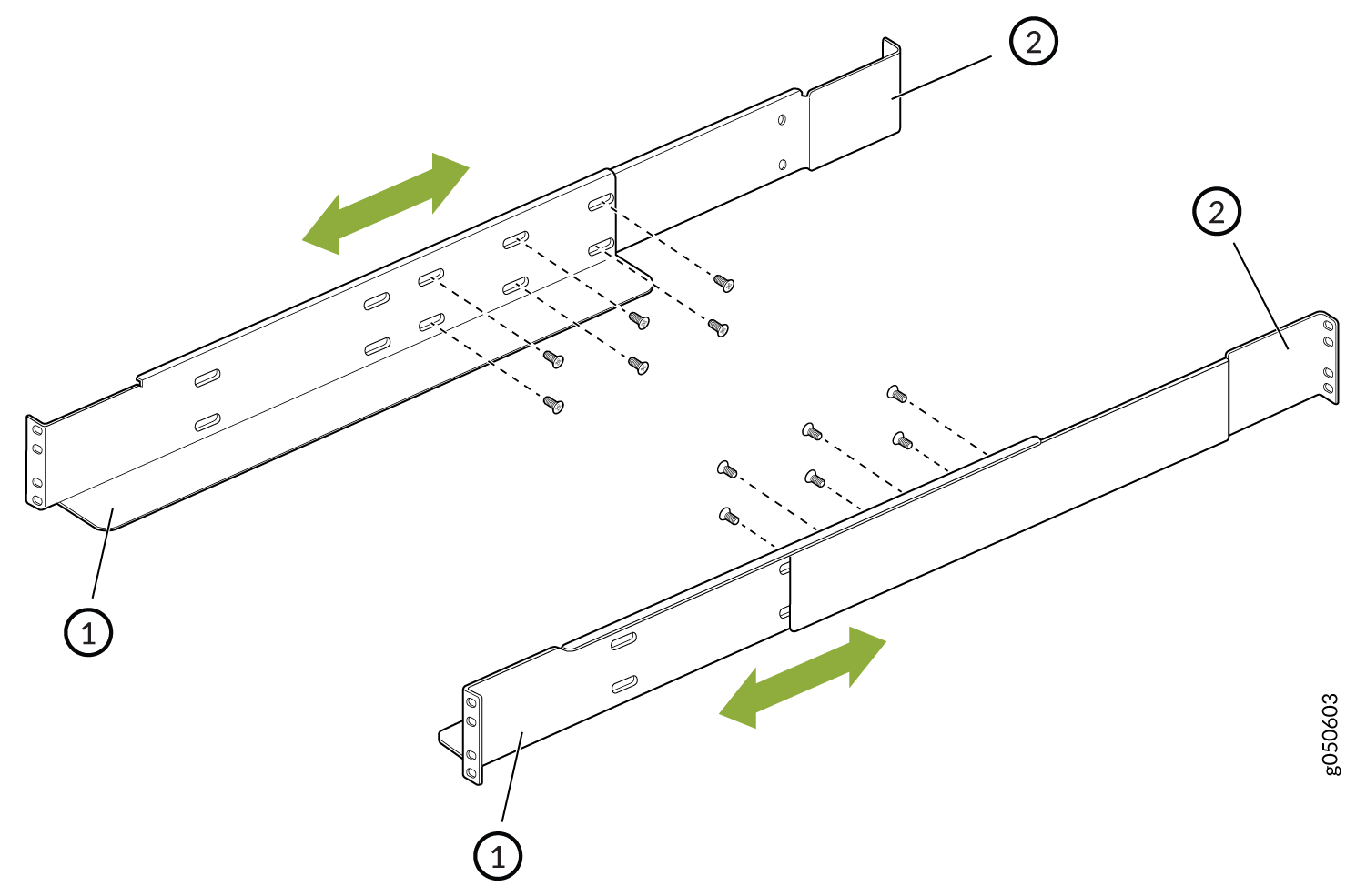 您可使用机架安装套件将 PTX10016 路由器安装在四柱式闭式机架或四柱式开式机架中。默认情况下,将发送部件号为 JNP10004-RMK-4POST 的机架安装套件。您可以单独订购部件号为 EX-MOD-RMK-4POST 的机架安装套件。在本主题中,我们将介绍如何使用 EX-MOD-RMK-4POST 机架安装套件安装路由器。