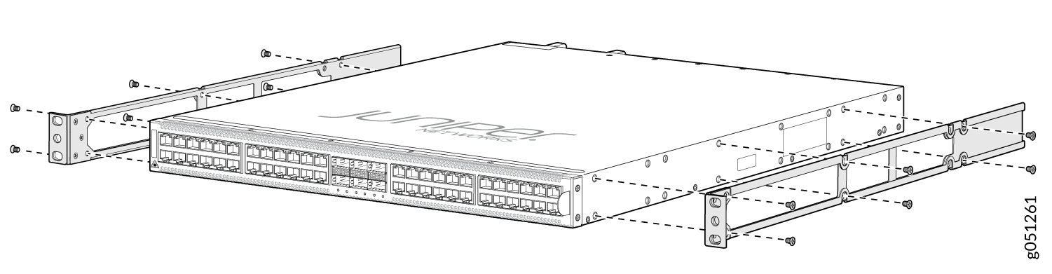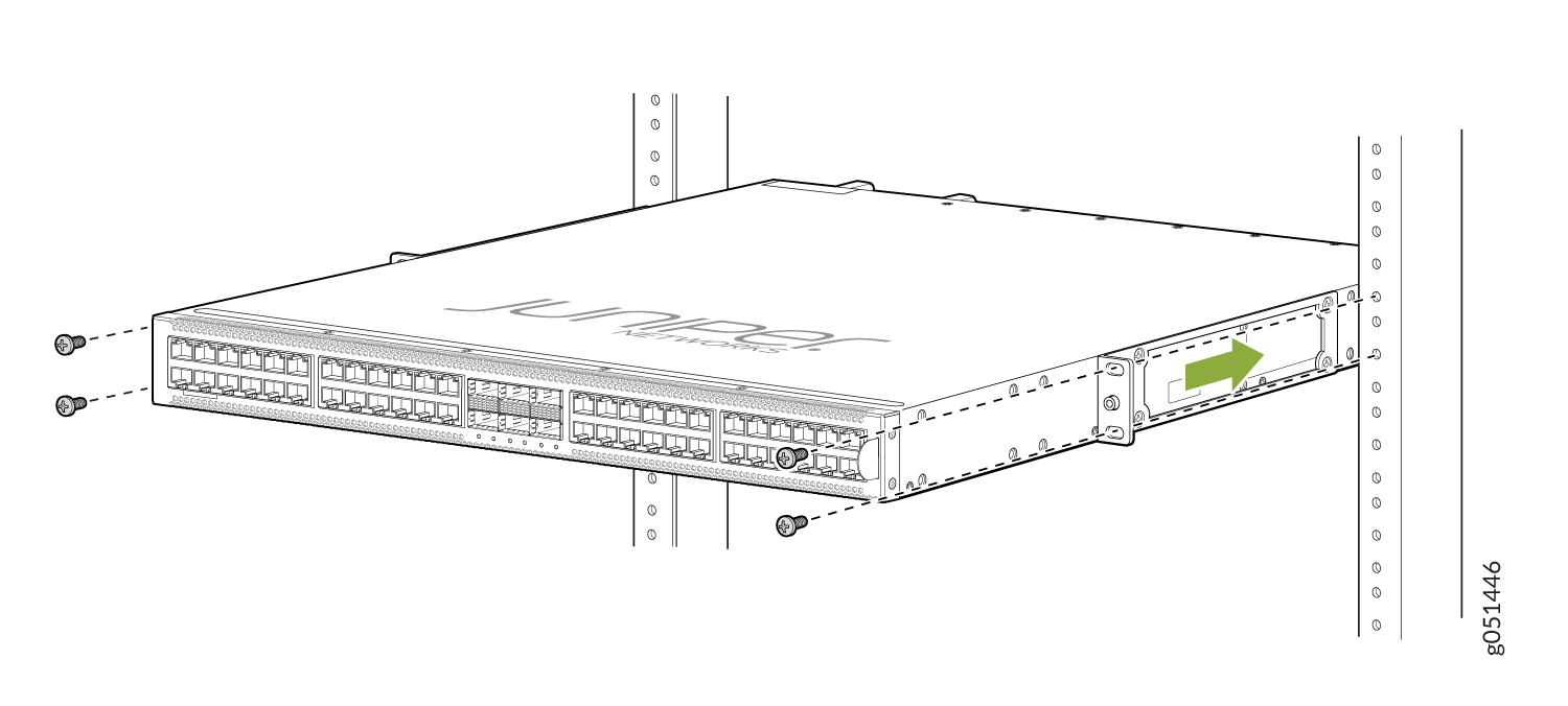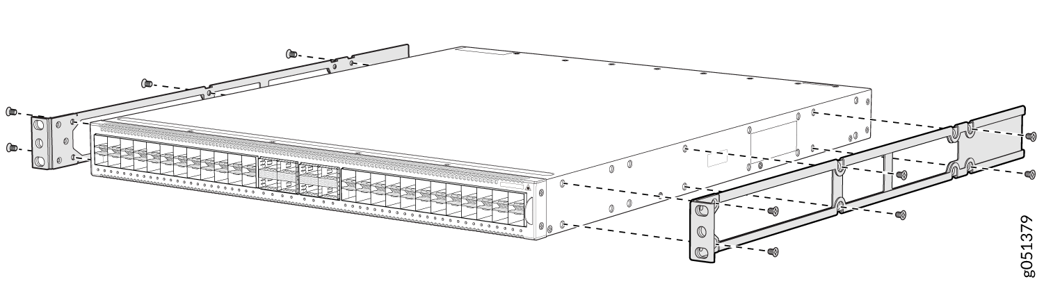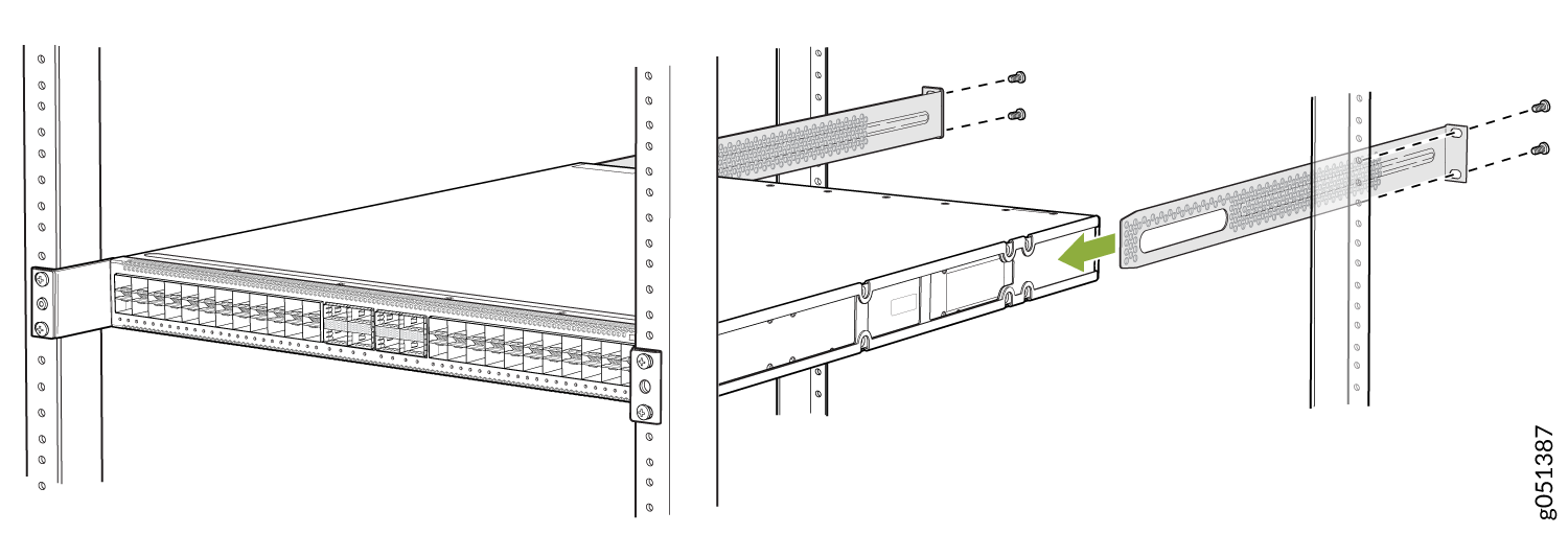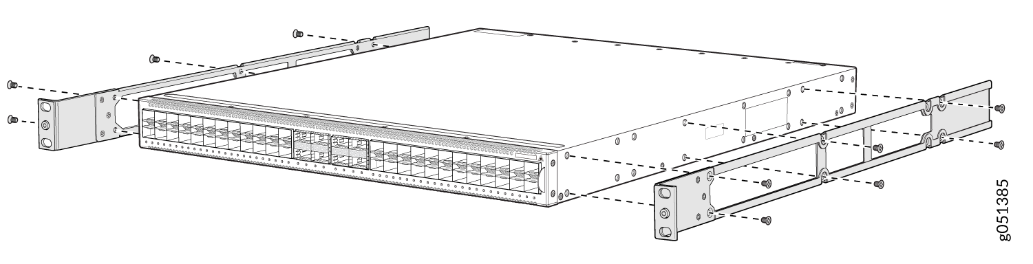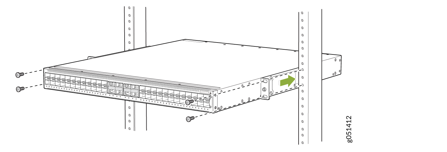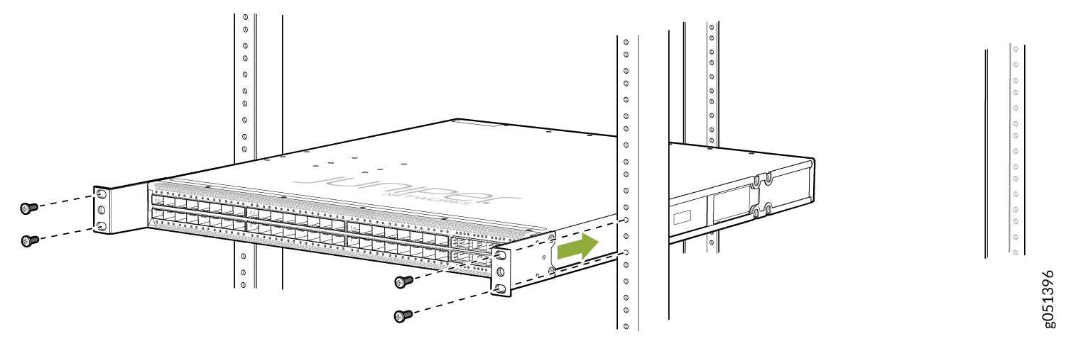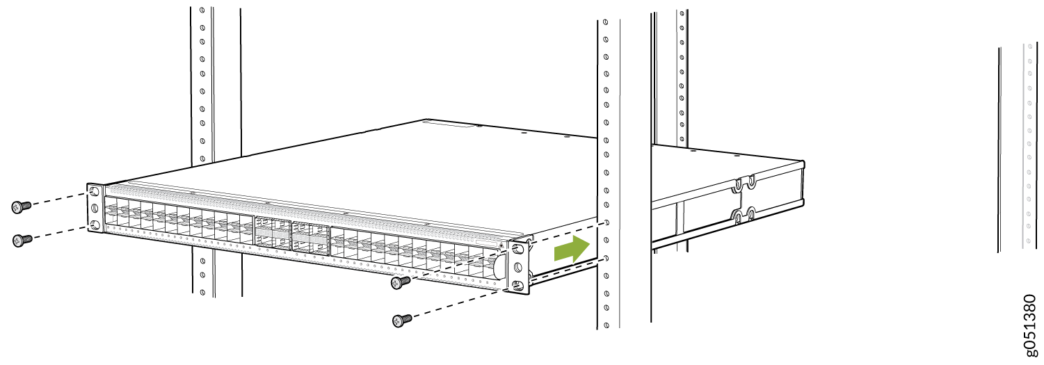 - 使用 QFX5120-32C-RMK-E 机架安装套件安装在螺纹孔 4 柱机架上,将 QFX5120-32C 安装在 4 柱机架上