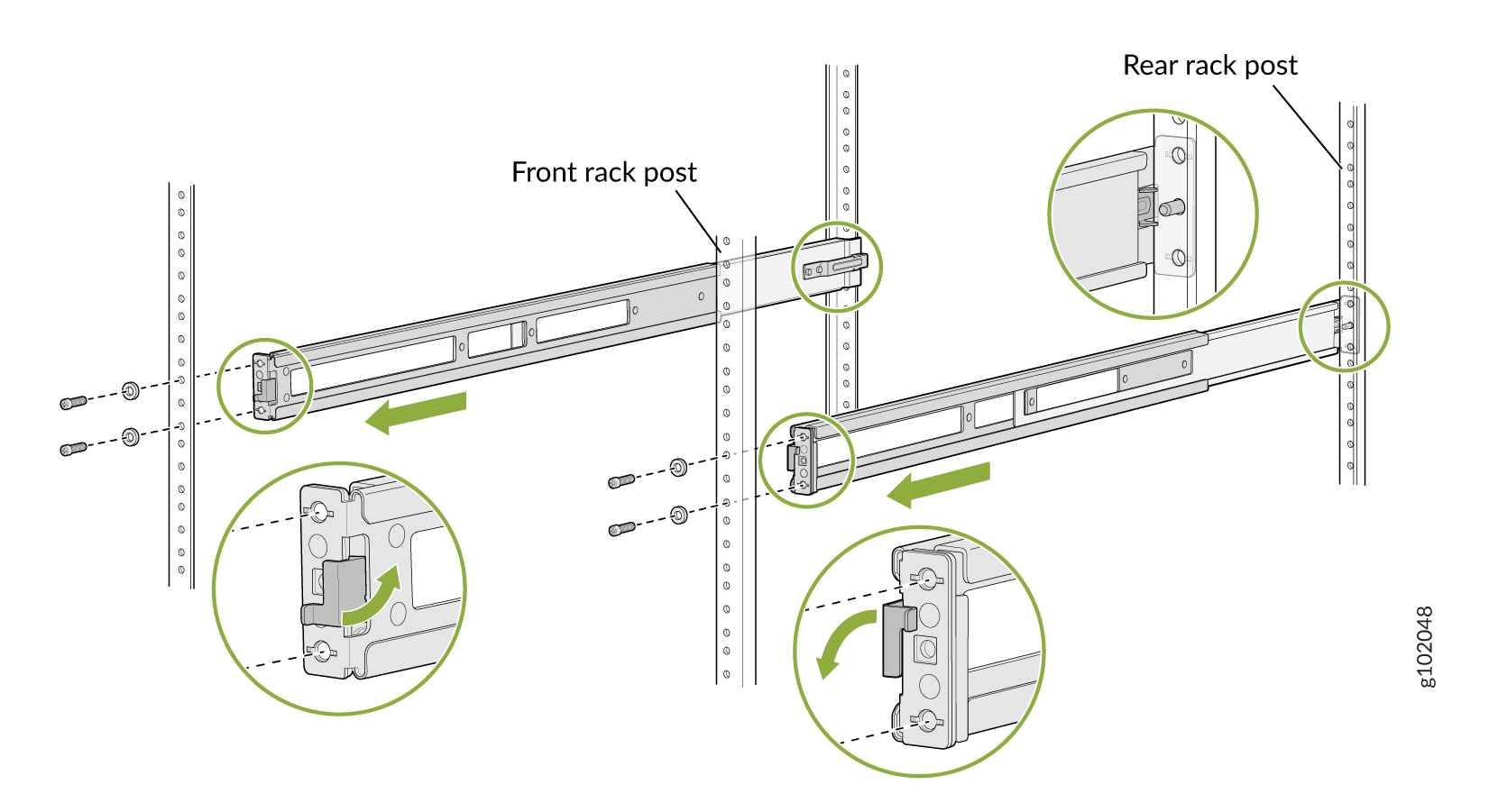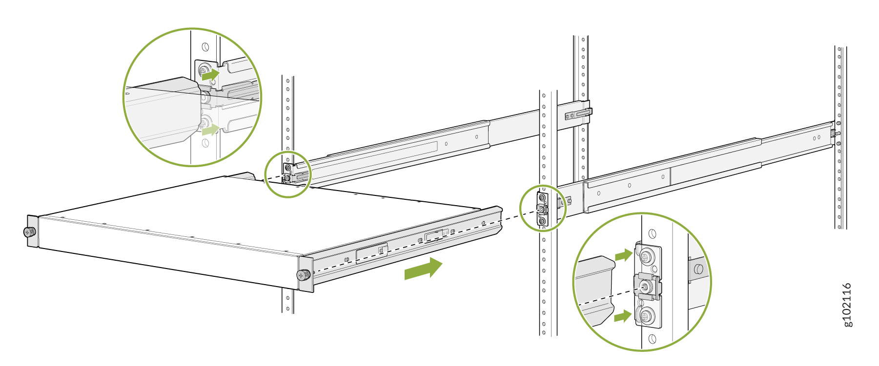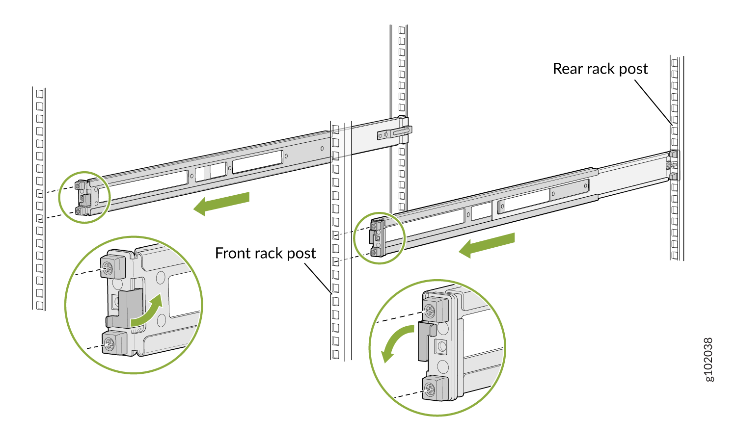 一对连接到机架柱的前后安装导轨 — 随机架安装套件提供