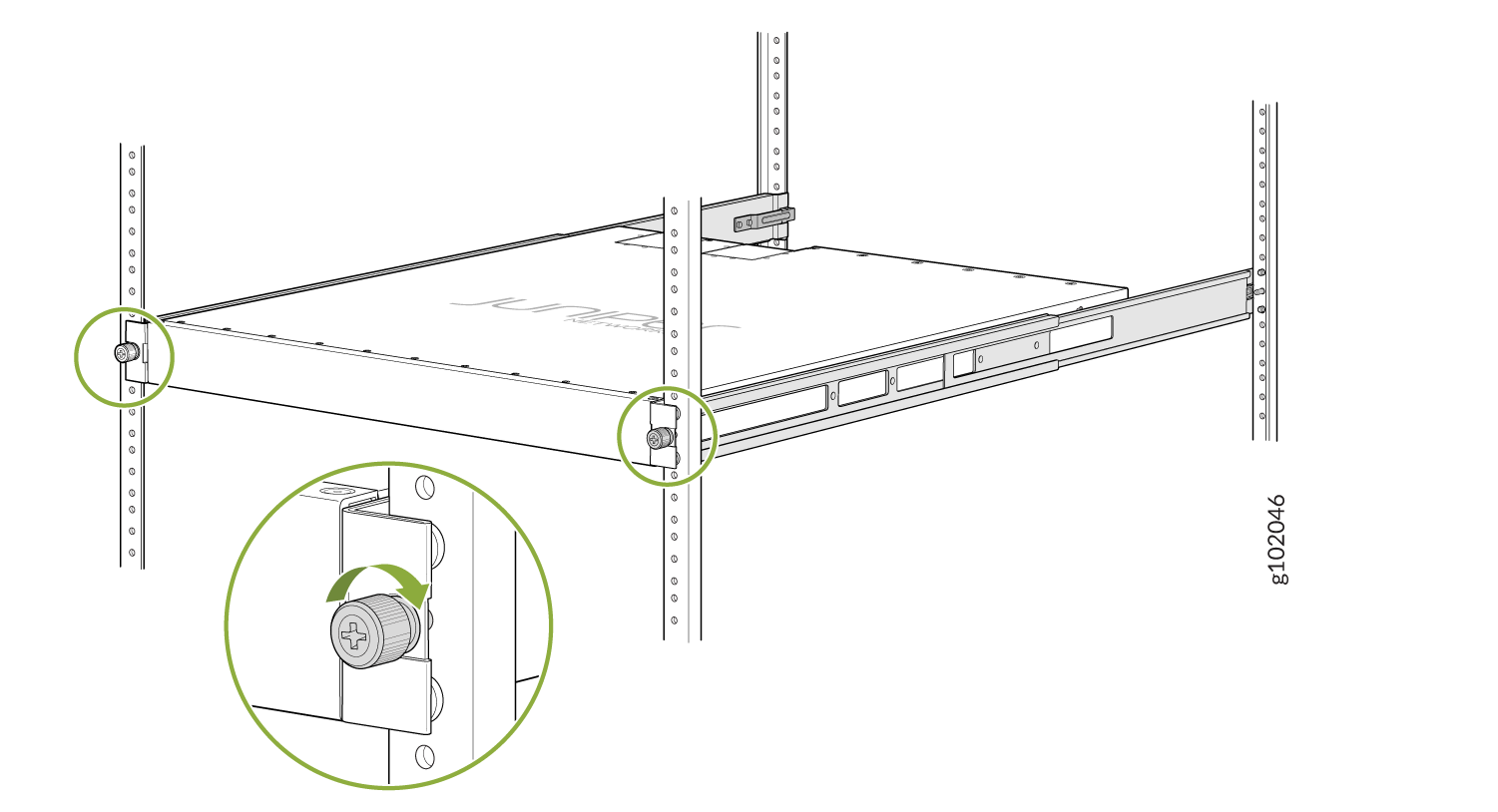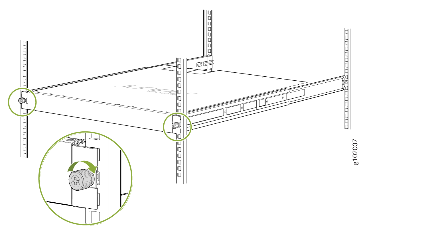 使用 JNP-4PST-RMK-1U-E 机架安装套件将设备安装在螺纹孔机架上