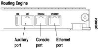 - 将更换串行电缆的 RJ-45 端插入 CONSOLE 或 AUX 端口。 图 4 显示了路由引擎上的外部设备端口。