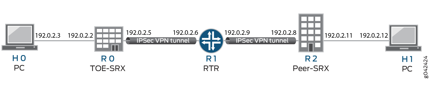 图 1 说明了本节所述所有示例中使用的 VPN 拓扑。在这里,H0 和 H1 是主机 PC,R0 和 R2 是 IPsec VPN 隧道的两个端点,R1 是在两个不同网络之间路由流量的路由器。
