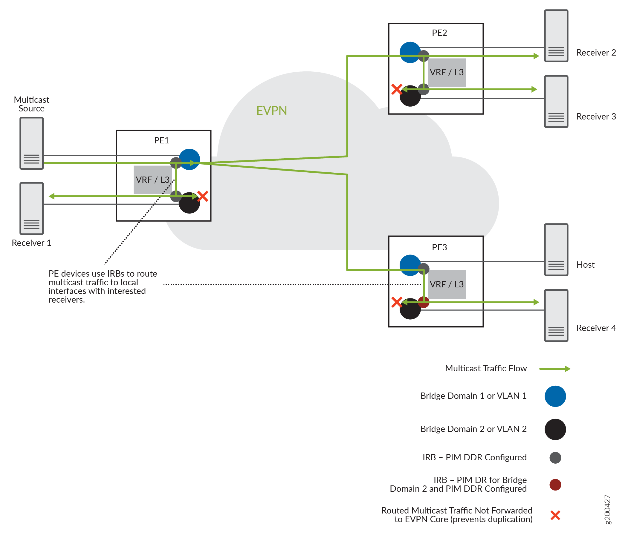 对于此环境中桥接域或 VLAN 之间的组播转发,PE 设备在 IRB 接口上的分布式指定路由器 (DDR) 模式下使用协议无关组播 (PIM)。