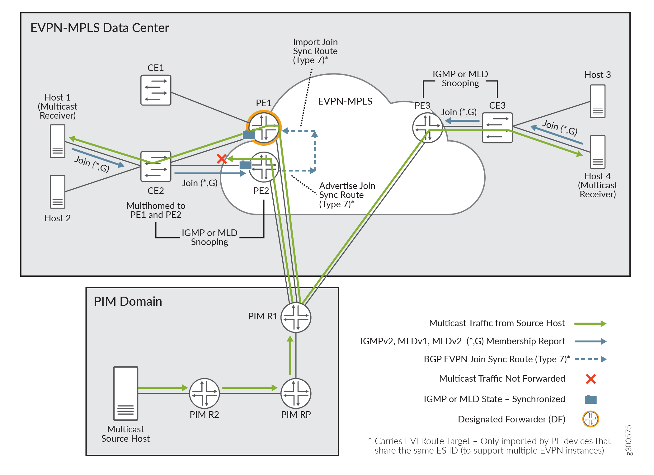 PE1 和 PE2 具有关于接收方主机 1 的同步 IGMP 或 MLD 状态信息,作为对等方 PE 设备,它们的行为方式与 EVPN-MPLS 网络内所有源和接收器的用例相同:
