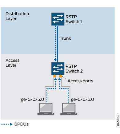 在第一种情况下,当交换机 2 接口上未禁用默认生成树协议 (RSTP) 时,此示例将在交换机 2 接口 ge-0/0/5.0 和 ge-0/0/6.0 上配置下游 BPDU 保护。启用 BPDU 保护后,默认情况下将启用该 shutdown 语句,如果便携式计算机生成的 BPDU 尝试访问交换机 2,交换机接口将关闭。