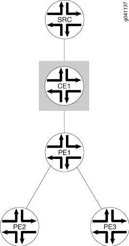在某些情况下,组播源和接收器可能会直接连接到入口/出口 PE 路由器。例如,在 PE 路由器中使用 EVPN 来实现第 2 层冗余时,信号源和接收器通过第 2 层交换机连接,因此不再需要 CE 路由器。由于默认在 PE 路由器上安装 (*,G) 转发条目,流经这些 PE 路由器的流量将直接通过 (*,G) 条目进行转发,并且不会生成解析请求。因此,不会触发寄存器状态创建和切换到最短路径树的过程。可以通过在 PE 路由器上配置 sg-forwarding-only 语句来避免这种情况。