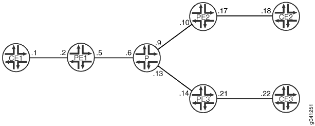 每个参与互联网组播的路由器都必须配置基于 BGP MPLS 的互联网组播,用于控制平面过程,并为数据提供程序隧道配置入口复制,从而形成完整的 MPLS 点对点 LSP 网格。入口复制隧道可以是选择性的,也可以是包容性的,与路由实例中提供程序隧道的配置相匹配。