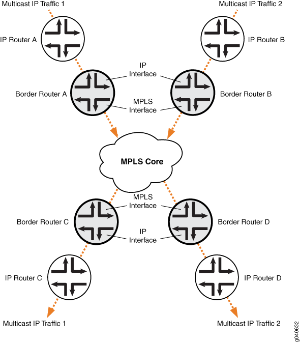 拓扑由位于 IP 组播域边缘的路由器组成,这些路由器具有一组 IP 接口和一组面向 MPLS 核心的接口,参见 图 1。互联网组播流量通过 MPLS 云在 IP 路由器之间传输,使用入口复制隧道作为数据平面,使用全网状 IGBP 会话作为控制平面。
