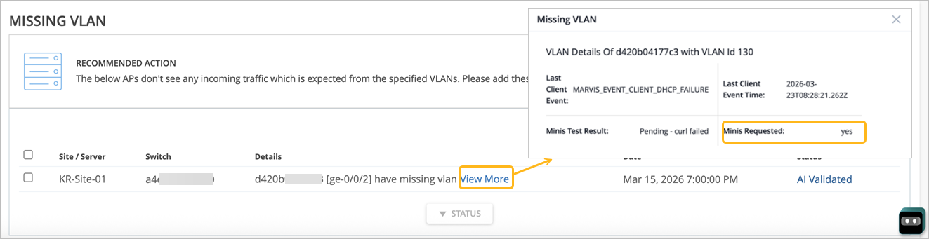 如果启用了 Marvis Minis,则当 Marvis 发现网络中存在潜在的 VLAN 丢失问题时,验证就会自动启动。Marvis Minis 会验证可疑 VLAN 路径上的连接,以确认 VLAN 是否丢失,并查明可能出现问题的位置。 查看更多 链接提供 Marvis Minis 验证的详细信息,如以下示例所示。