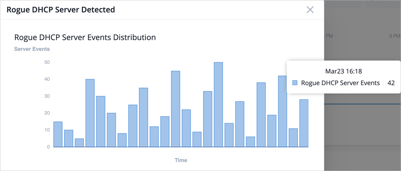 单击“ 查看更多 ”链接将显示一个图表,其中显示了 24 小时内与恶意服务器相关的事件。将鼠标悬停在图表上会显示检测到的事件的日期、时间和数量。您还可以在“交换机洞察”页面上作为交换机事件的一部分查看事件。
