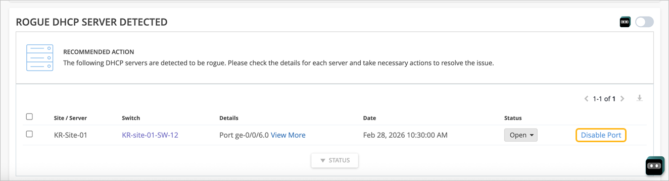 如果您为此操作启用了自我驱动功能,Marvis 会自动禁用恶意 DHCP 服务器使用的交换机端口。 请注意,这仅适用于接入端口。