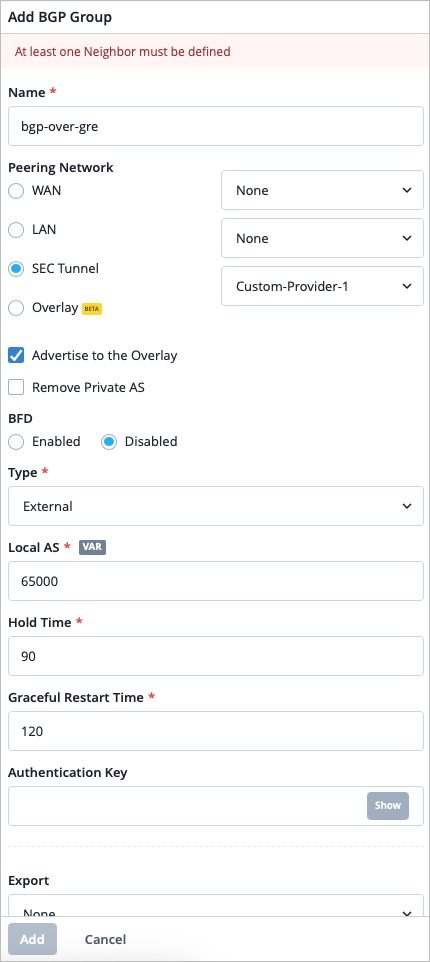 要验证您创建的基于WAN Edge 的 BGP GRE 会话,可以使用 WAN Edge 测试工具: