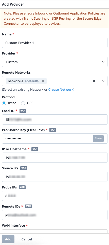 创建入站或出站应用程序策略。如果要允许来自远程网络的流量进入本地网络,则需要创建一个表示远程网络的网络。将此网络附加到自定义安全边缘连接器 (SEC) 提供程序,并将其用作应用程序策略中的源。