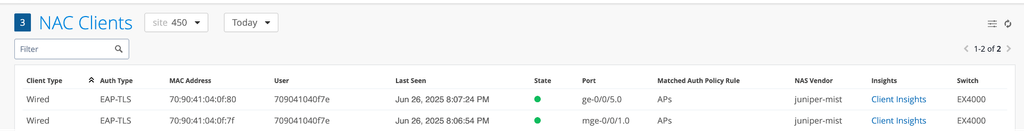 トラフィックを Mist Edge にトンネリングする場合など、AP スイッチ ポートに MAC 制限を適用する場合は、MAC 制限を 2 つ以上(イーサネット MAC 用と AP MAC 用)に設定します。