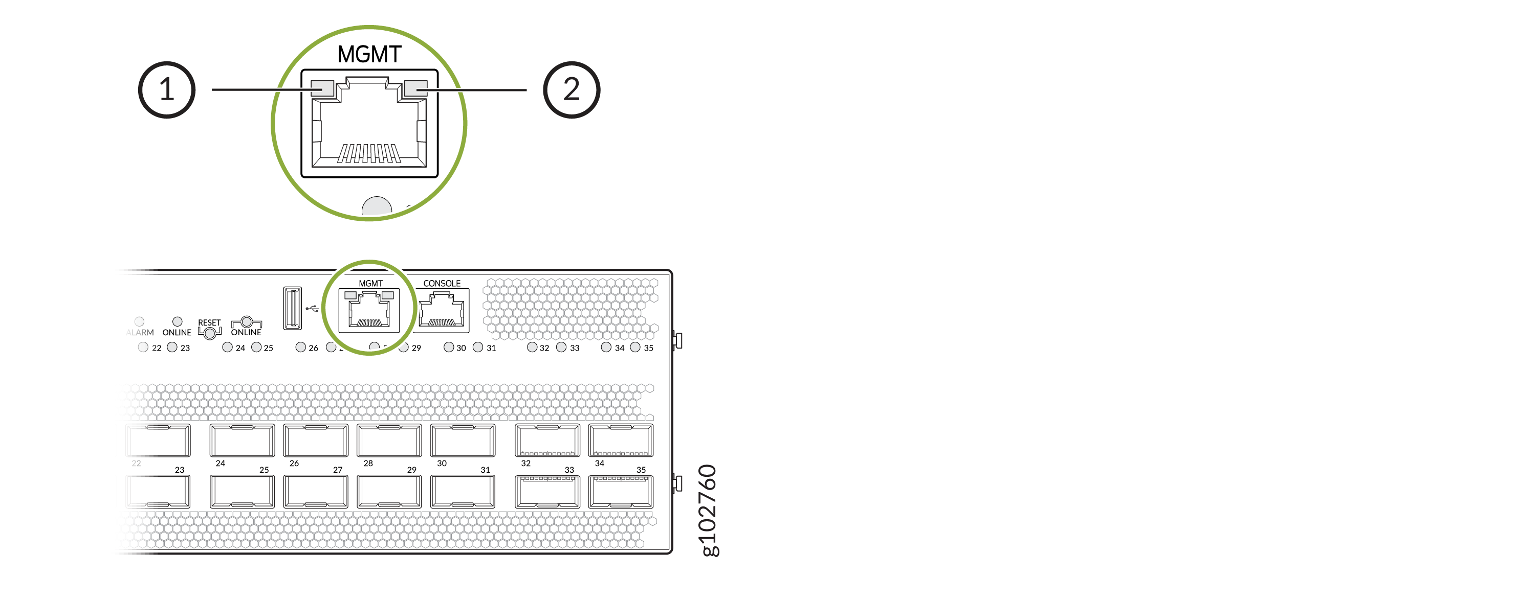 図 1 は、管理ポートの LED を示しています。表 3 では、RJ-45 コネクタ付きの管理ポートの LED について説明します。