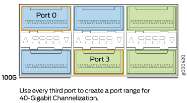 先行するポート(0、2、18、および20)が100Gbpsモードでない場合、ポート1、3、19、および21は未使用として設定する必要があります。つまり、PTX10K-LC1202-36MRラインカードの36ポートのうち、4x25GbEポートまたは4x10GbEポートとして設定できるのは32ポートのみであるということです。
