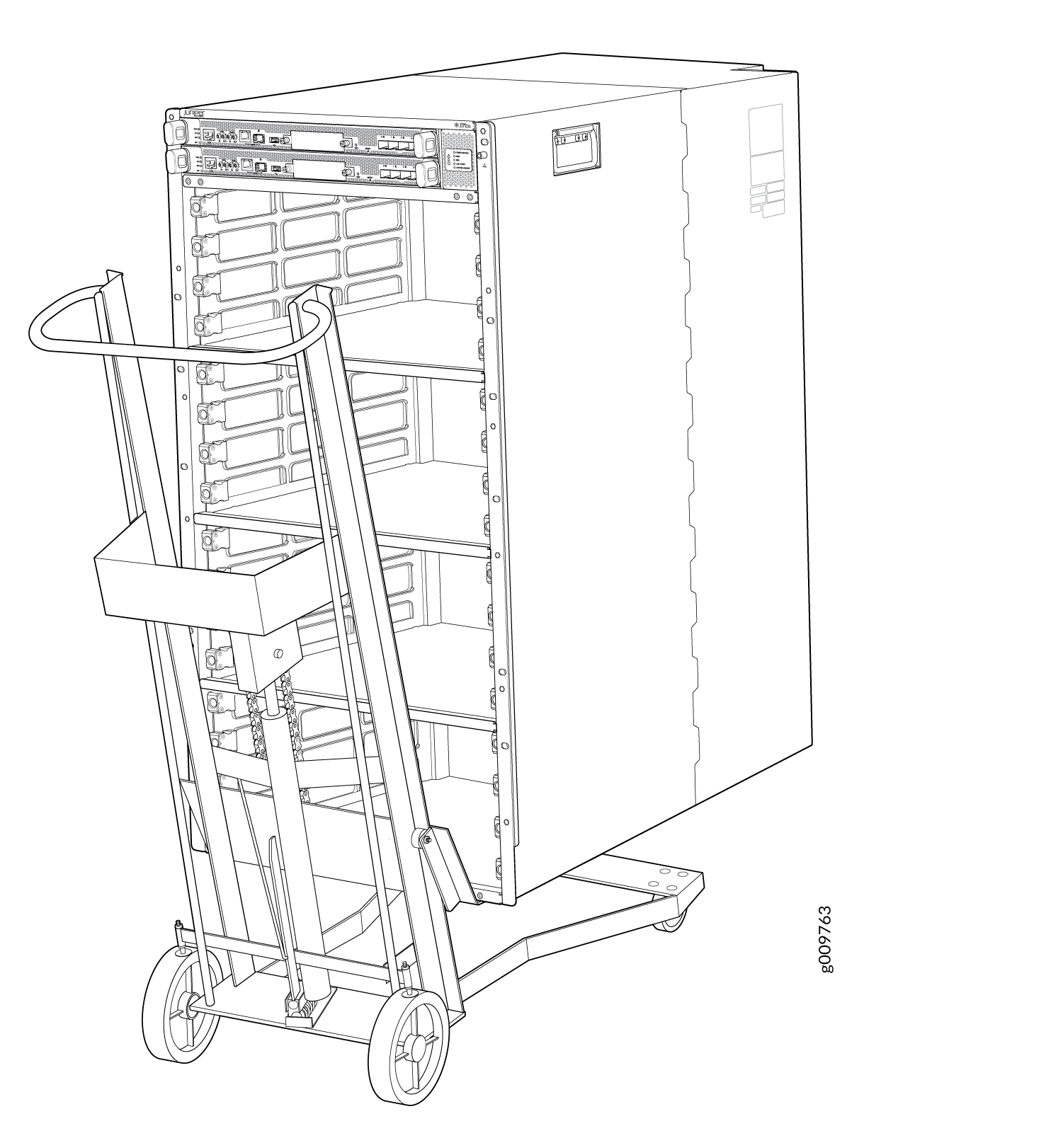 리프트를 사용하여 라우터를 랙 앞에 정렬하고 장착 트레이 앞의 중앙에 맞춥니다.