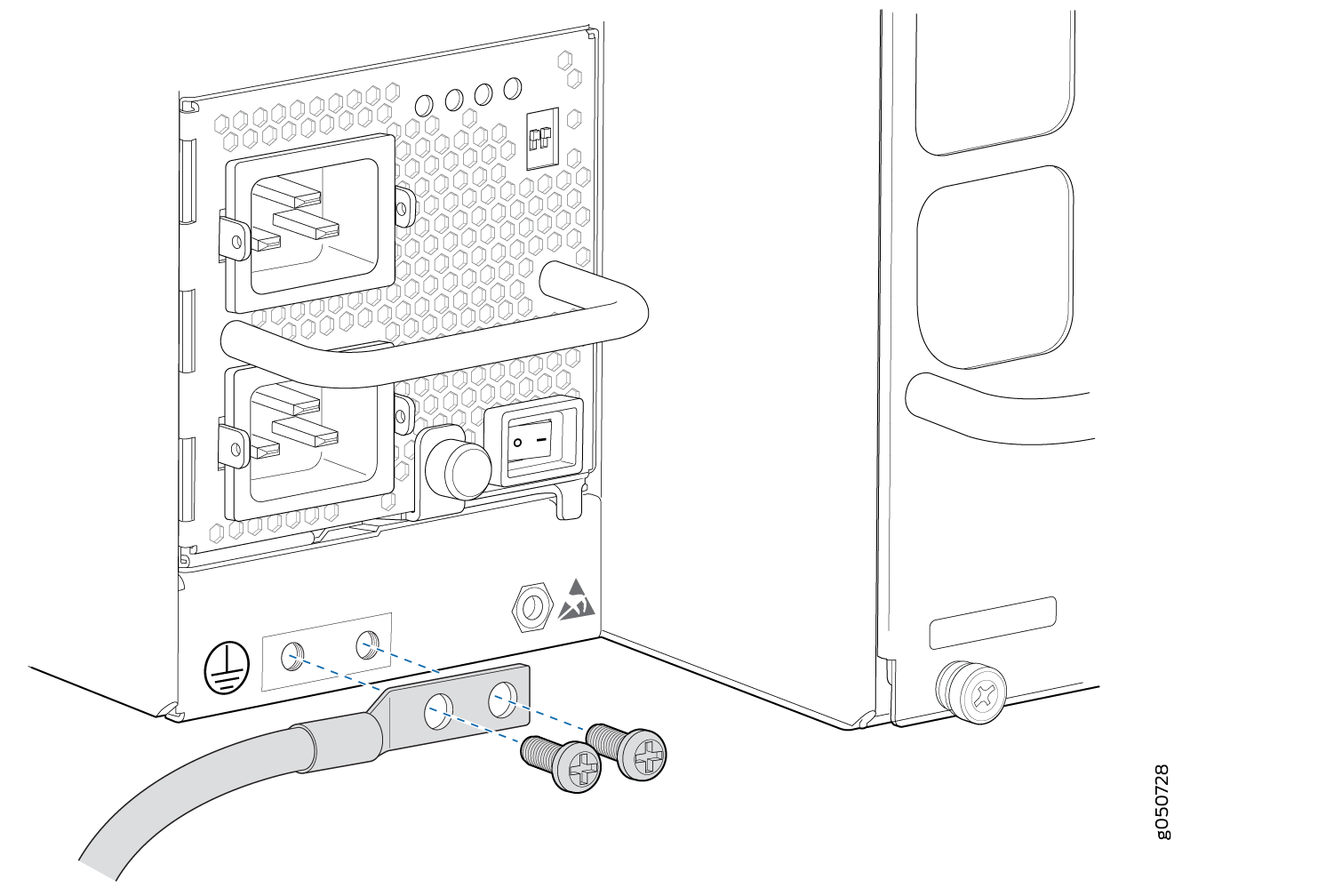 접지 러그와 접지 케이블 위에 두 개의 나사를 놓습니다.