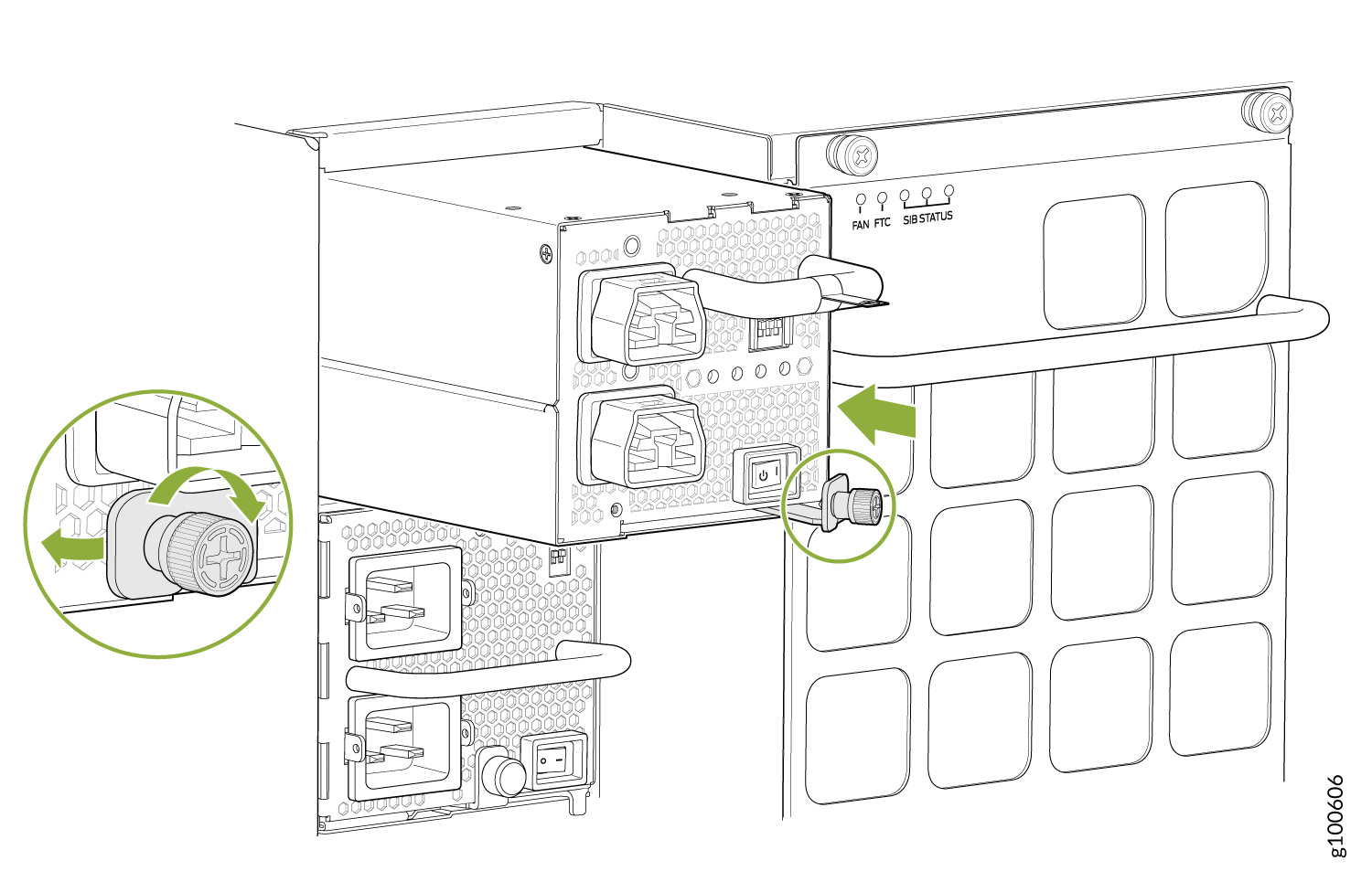 캡티브 나사를 전원 공급장치 면판에 밀어 넣습니다. 나사가 전면판의 해당 구멍 안에 안착되었는지 확인합니다.