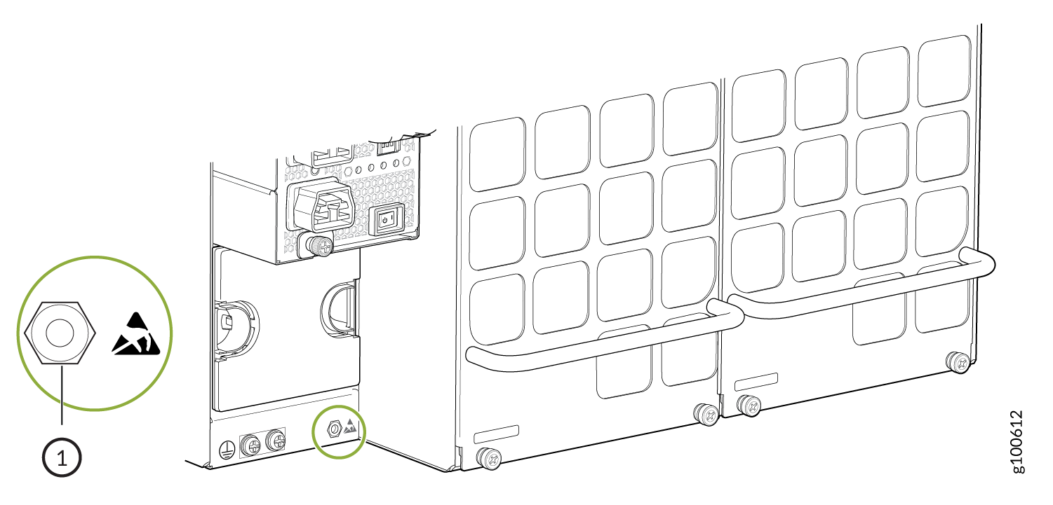 맨 손목에 ESD 접지 스트랩의 한쪽 끝을 감싸고 스트랩의 다른 쪽 끝을 섀시의 ESD 지점에 연결합니다. 보호 접지 단자 옆과 PTX10016 후면의 PSU 9 아래에 ESD 지점이 있습니다.