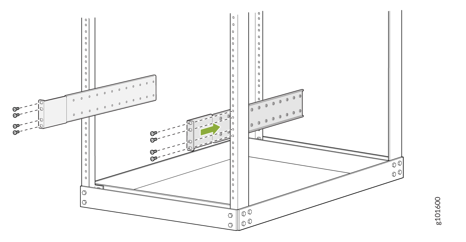 JNP10004-RMK-4POST 랙 마운트 키트 또는 EXMOD-RMK-4POST 랙 마운트 키트를 사용하여 4포스트 폐쇄 프레임 랙 또는 4포스트 오픈 프레임 랙에 PTX10016 라우터를 설치할 수 있습니다. JNP10004-RMK-4POST 랙 마운트 키트를 사용하여 프리미엄 중복 구성 PTX10016 라우터를 설치하고 전원에 연결하는 단계를 안내합니다.