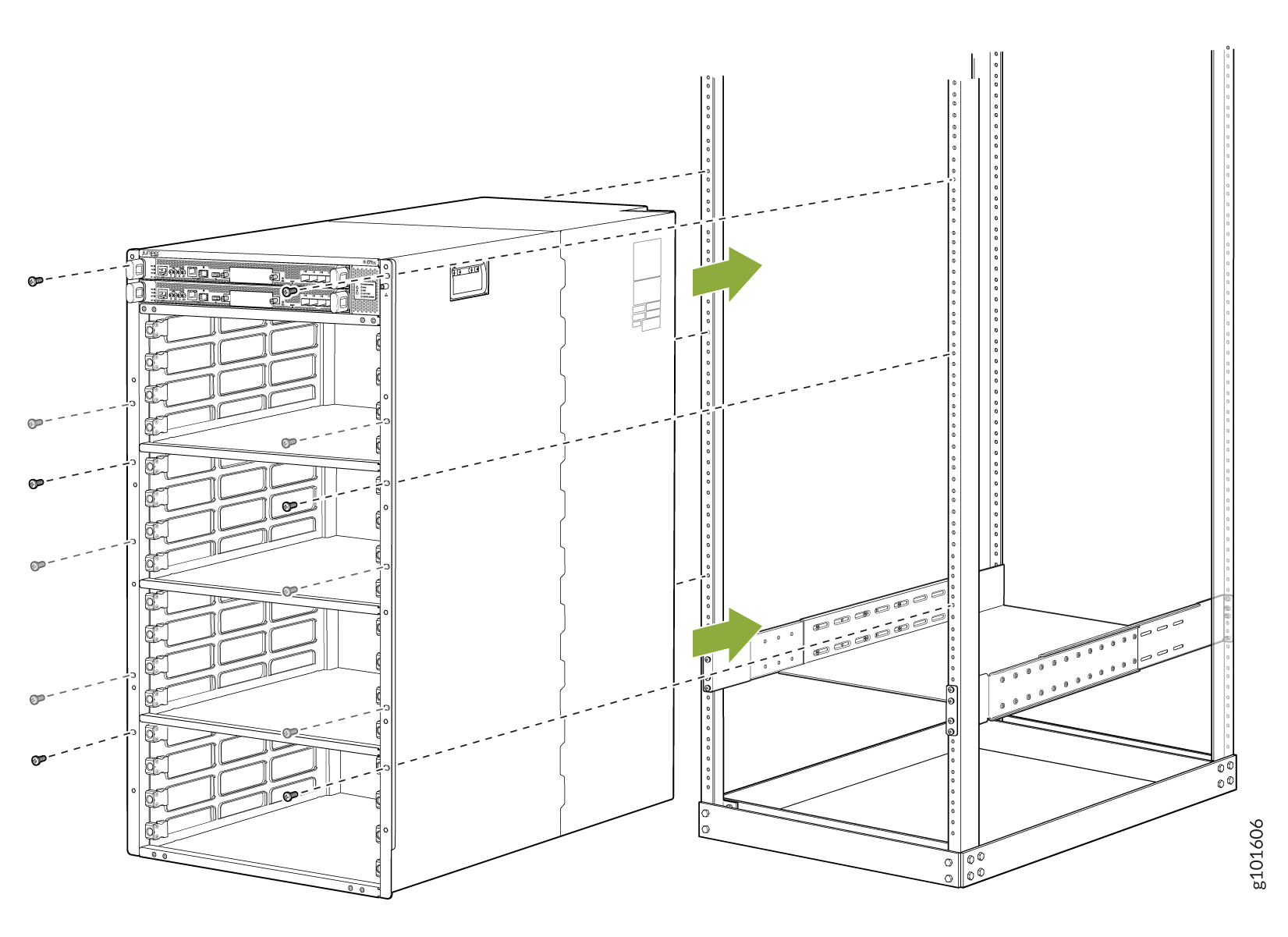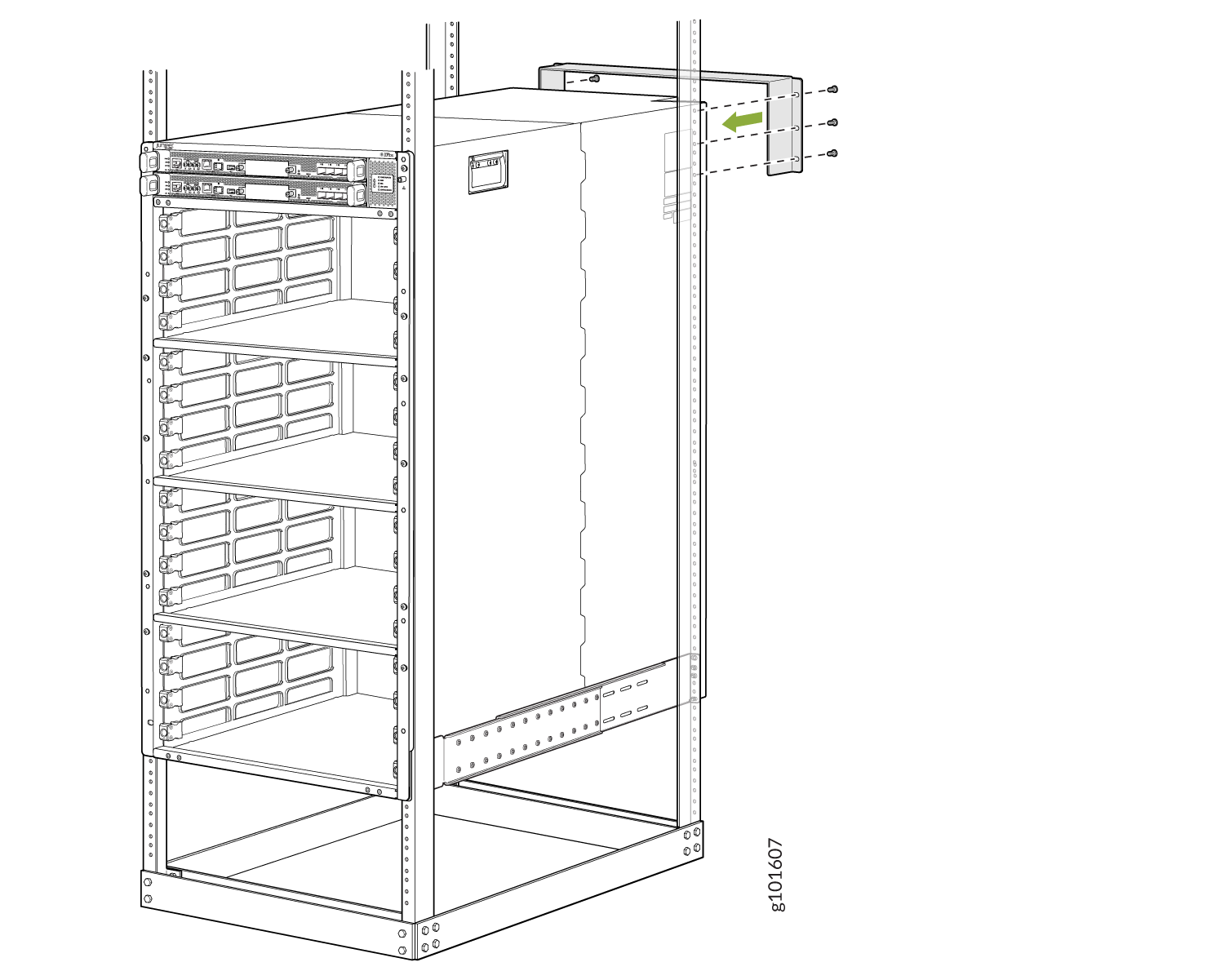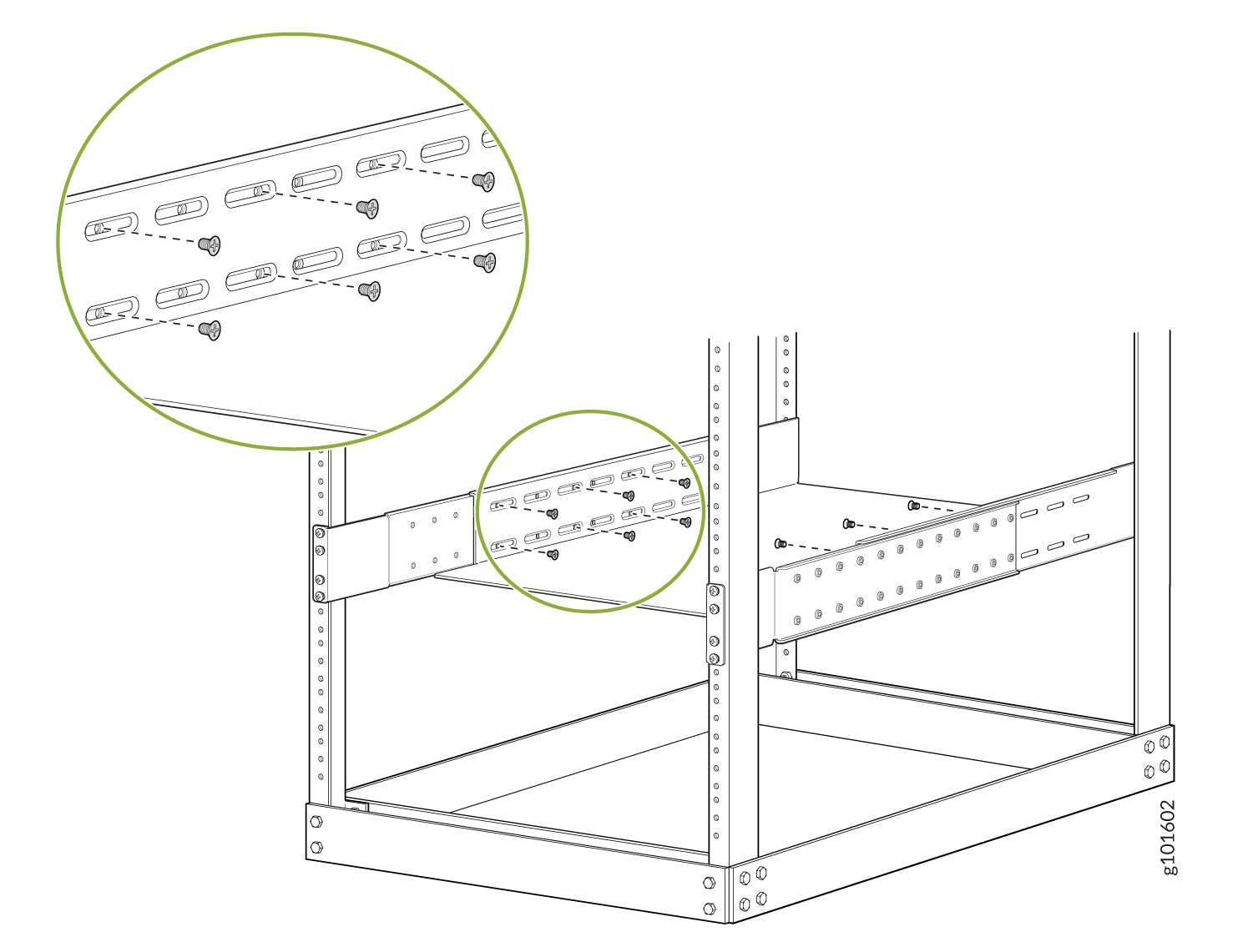 각 열린 플랜지 구멍과 랙 구멍을 통해 14개의 랙 마운트 나사를 설치하여 섀시를 랙에 부착합니다.