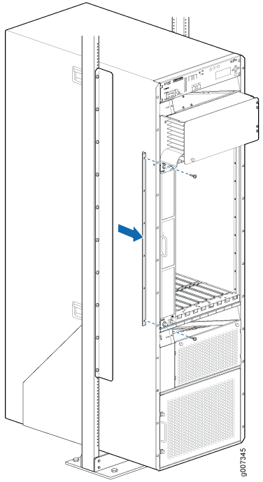 개방형 프레임 랙에 PTX5000을 설치하려는 경우 섀시가 랙에 장착되기 전에 도어를 설치할 수 있습니다. 그러나 이 절차는 라우터가 랙에 설치되어 접지되었다고 가정합니다. 라우터를 접지하기 전에 도어를 설치하는 경우 적절한 사이트 접지를 사용해야 합니다.
