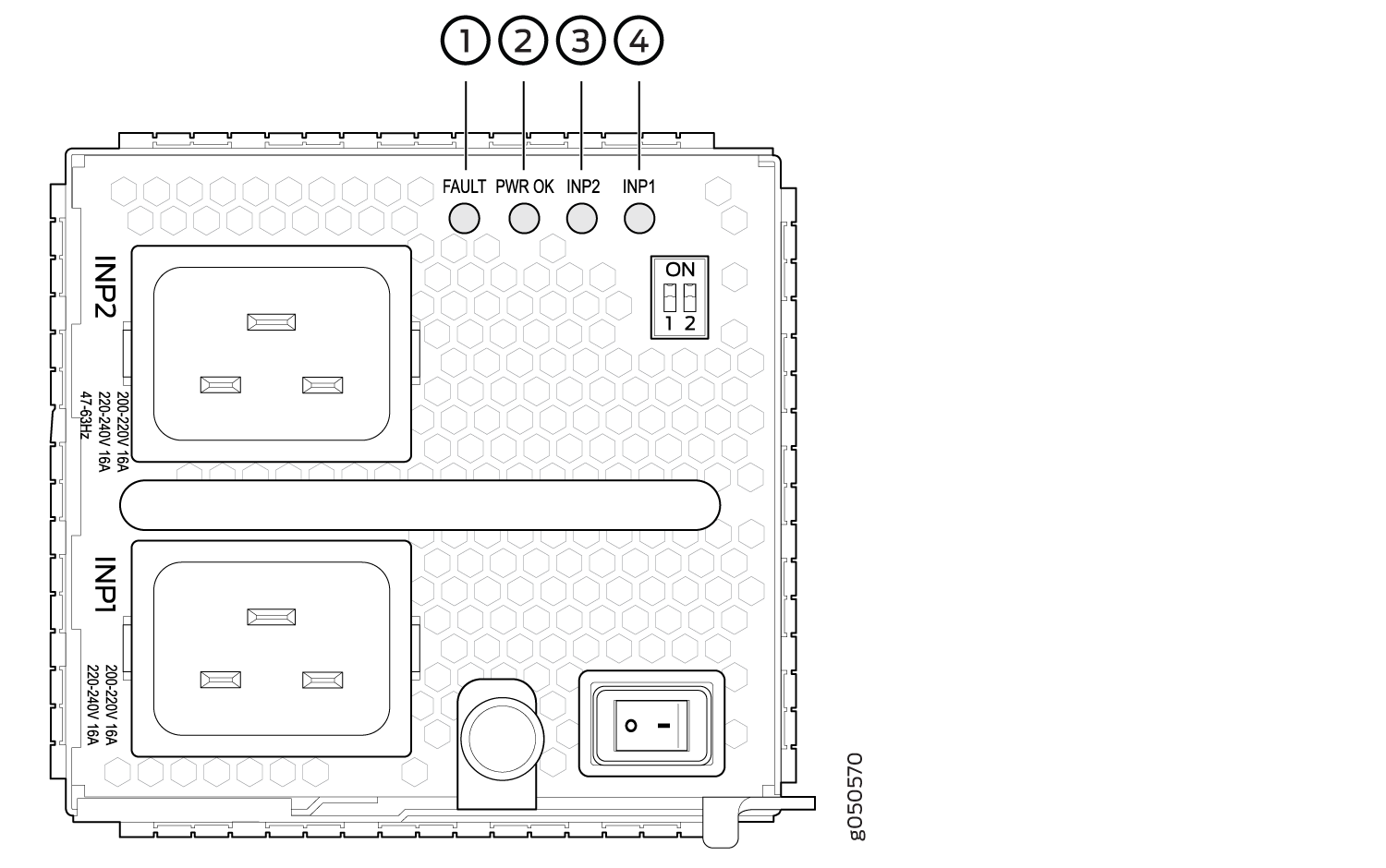 각 QFX10000-PWR-AC 전원 공급장치에는 온(|) 및 오프(O)에 대한 국제 표시가 있는 전원 스위치, 팬, 전원 공급장치의 상태를 나타내는 전면판의 LED가 4개 있습니다. 그림 1을 참조하십시오.