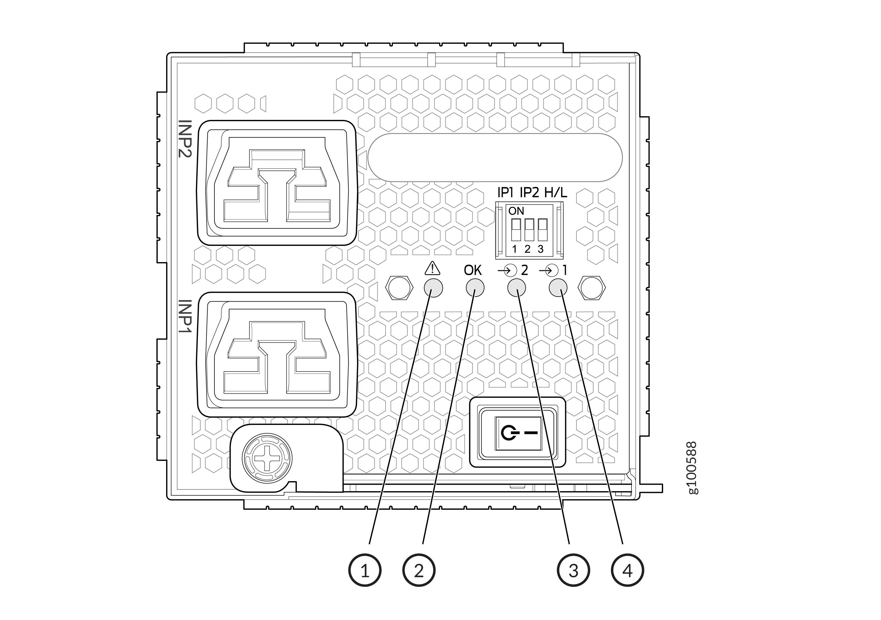 JNP10K-PWR-AC2 전원 공급장치의 페이스플레이트에는 !, OK, 2 및 1의 4개의 LED가 있습니다. 이 LED는 전원 공급 장치의 상태에 대한 정보를 표시합니다. 그림 8을 참조하십시오.