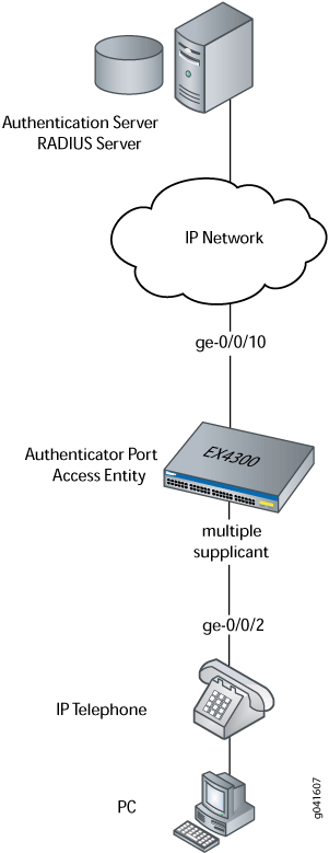 이 예에서 EX4200 스위치의 액세스 인터페이스는 ge-0/0/2 802.1X가 아닌 IP 전화에 연결됩니다.