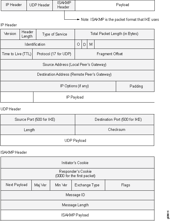 터널링이 필요한 주니퍼 네트웍스 디바이스에 일반 텍스트 패킷이 도착하고 해당 터널에 대한 활성 2단계 SA가 없으면 Junos OS는 IKE 협상을 시작하고 패킷을 삭제합니다. IP 패킷 헤더의 소스 및 목적지 주소는 각각 로컬 및 원격 IKE 게이트웨이의 주소입니다. IP 패킷 페이로드에는 ISAKMP(IKE) 패킷을 캡슐화하는 UDP 세그먼트가 있습니다. IKE(Internet Key Exchange) 패킷의 형식은 1단계와 2단계에서 동일합니다. 를 참조하십시오 그림 1.