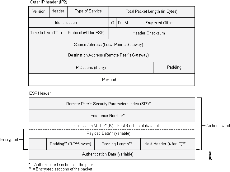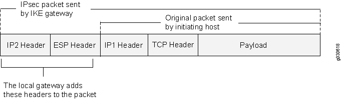 IKE 협상이 완료되고 두 IKE 게이트웨이가 1단계 및 2단계 SA를 설정하면 이후의 모든 패킷이 터널을 사용하여 전달됩니다. 2단계 SA가 터널 모드에서 ESP(Encapsulating Security Protocol)를 지정하는 경우 패킷은 에 그림 4표시된 것과 같습니다. 디바이스는 시작 호스트가 보내는 원래 패킷에 두 개의 추가 헤더를 추가합니다.