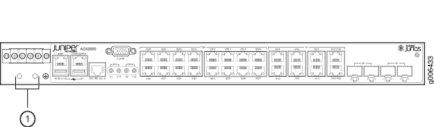 Debe instalar el ACX2200 en una ubicación de acceso restringido y asegurarse de que el chasis esté siempre conectado a tierra. El ACX2200 tiene un terminal de conexión a tierra protector de dos orificios provisto en el chasis. Consulte la figura 1. En todas las circunstancias, utilice esta conexión a tierra para conectar a tierra el chasis. Para los sistemas alimentados por CA, también debe usar el cable de conexión a tierra en el cable de alimentación de CA junto con la conexión de orejetas de conexión a tierra de dos orificios. Este sistema probado cumple o supera todos los requisitos reglamentarios EMC aplicables con el terminal de conexión a tierra de protección de dos orificios.